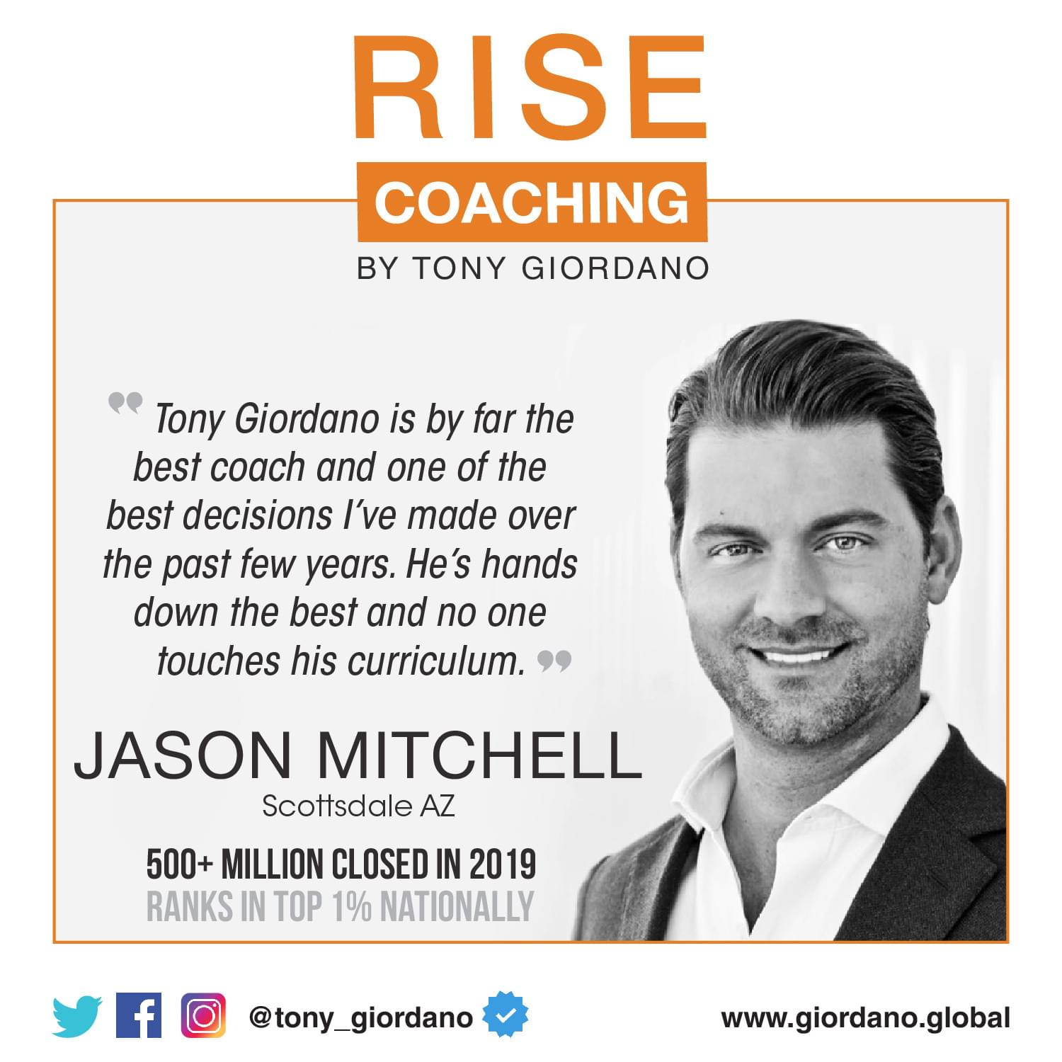 Jason Mitchell is a real estate powerhouse who founded Jason Mitchell Real Estate in 2006. Since then, The Jason Mitchell Group has achieved well over $2 Billion in sales volume in Arizona. For the past 3 years, Jason Mitchell has been ranked as the #1 producing resale agent in the state of Arizona and has been voted Arizona’s #1 real estate team two years in a row. In 2018, Jason started coaching with Tony and went from closing over 200 million in volume, to over 600 million closed in 2019!